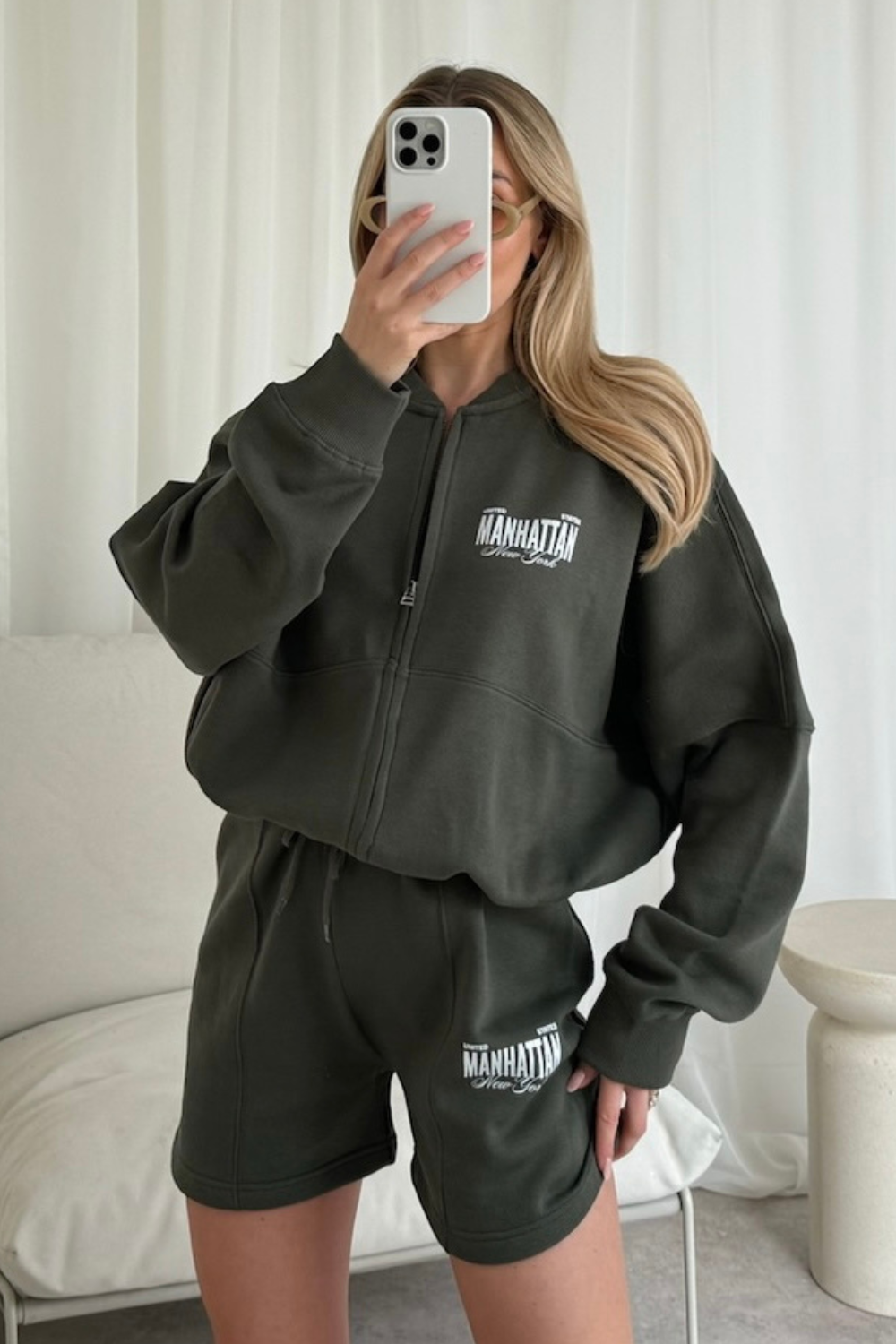 Stay stylish while lounging in printed bomber jacket and seam detail shorts set. Featuring a gorgeous bomber jacket, constructed from light and soft fabric for a comfortable fit, and shorts with a drawstring waistband, this loungewear set is perfect for those looking for a chic, yet comfortable, look.