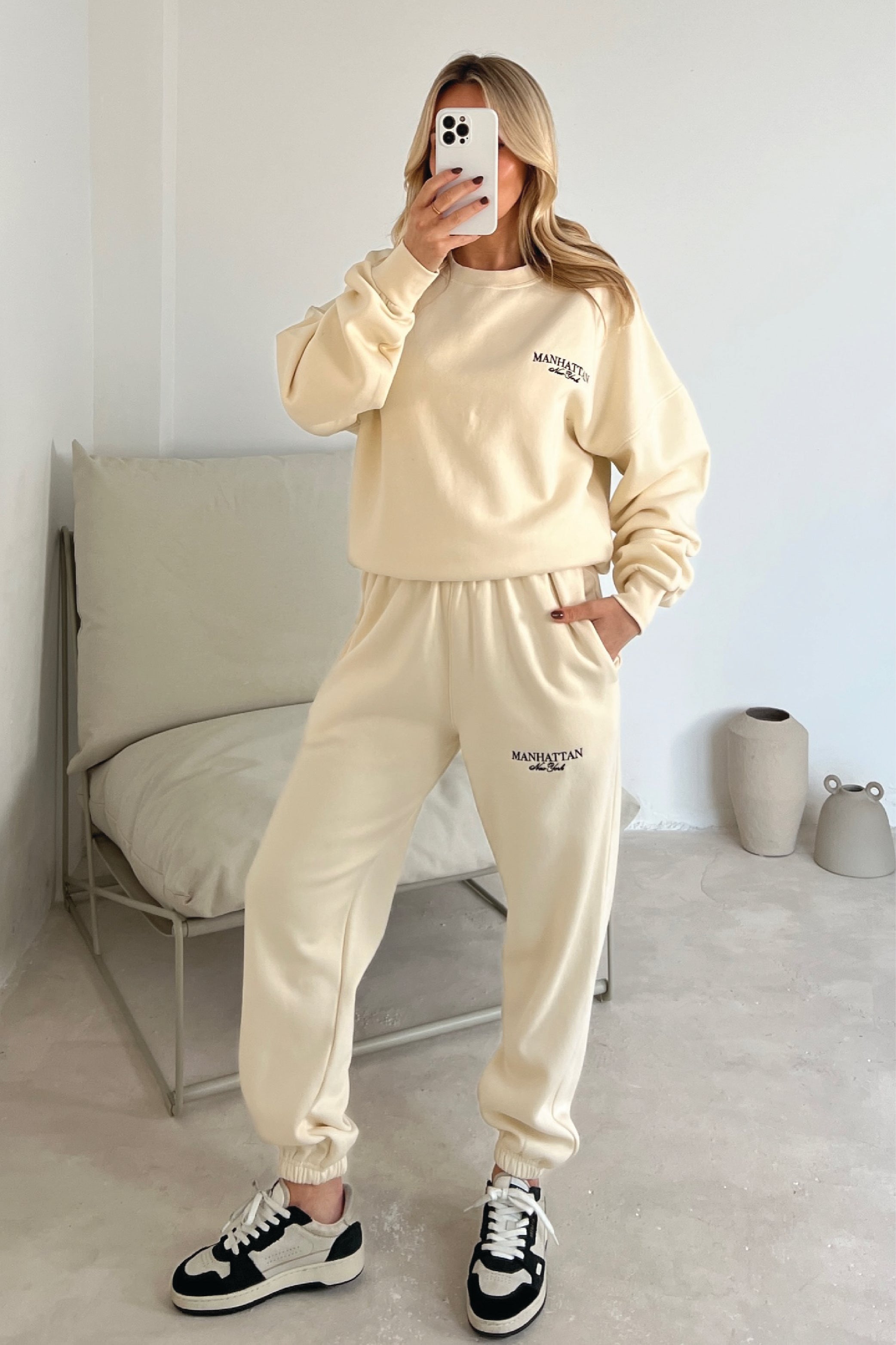 Introducing our new sweater set 'manhattan ' , the set consists of a stunning sweater that has a round neck and dropped shoulders with our in house design printed on the chest. This also comes with a matching pair of drawstring joggers. Style with fresh trainers for a complete look.