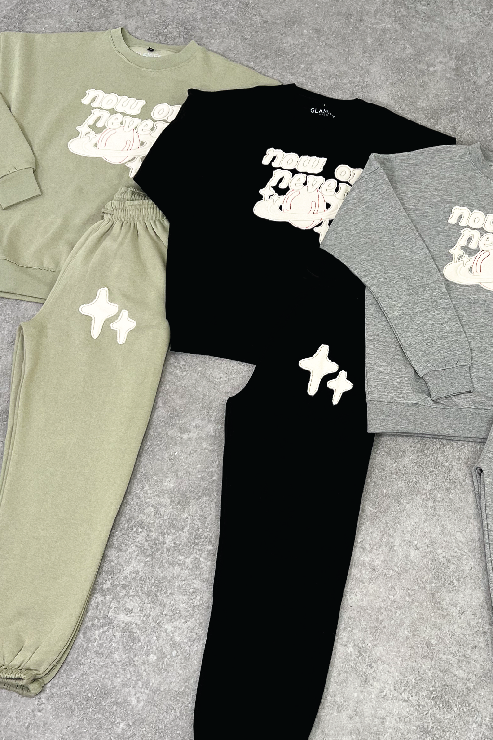 Introducing our new sweater set 'Now or never' , the set consists of a stunning sweater that has a round neck and dropped shoulders with our in house design applique on the chest. This also comes with a matching pair of drawstring joggers. Style with fresh trainers for a complete look.