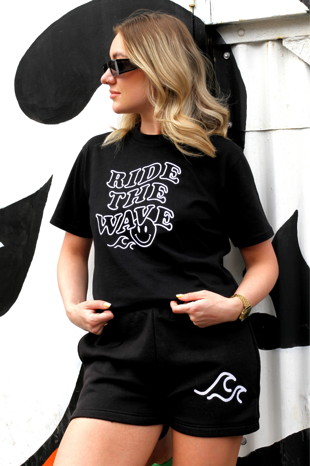 This is our ride the wave set , the set comes with a stunning premium black tee that has a stunning ride the wave design embroidered across the front in a white thread, this set also has matching black drawstring shorts which have an elasticated waist. This set is perfect for day to day and it is also the perfect airport outfit.