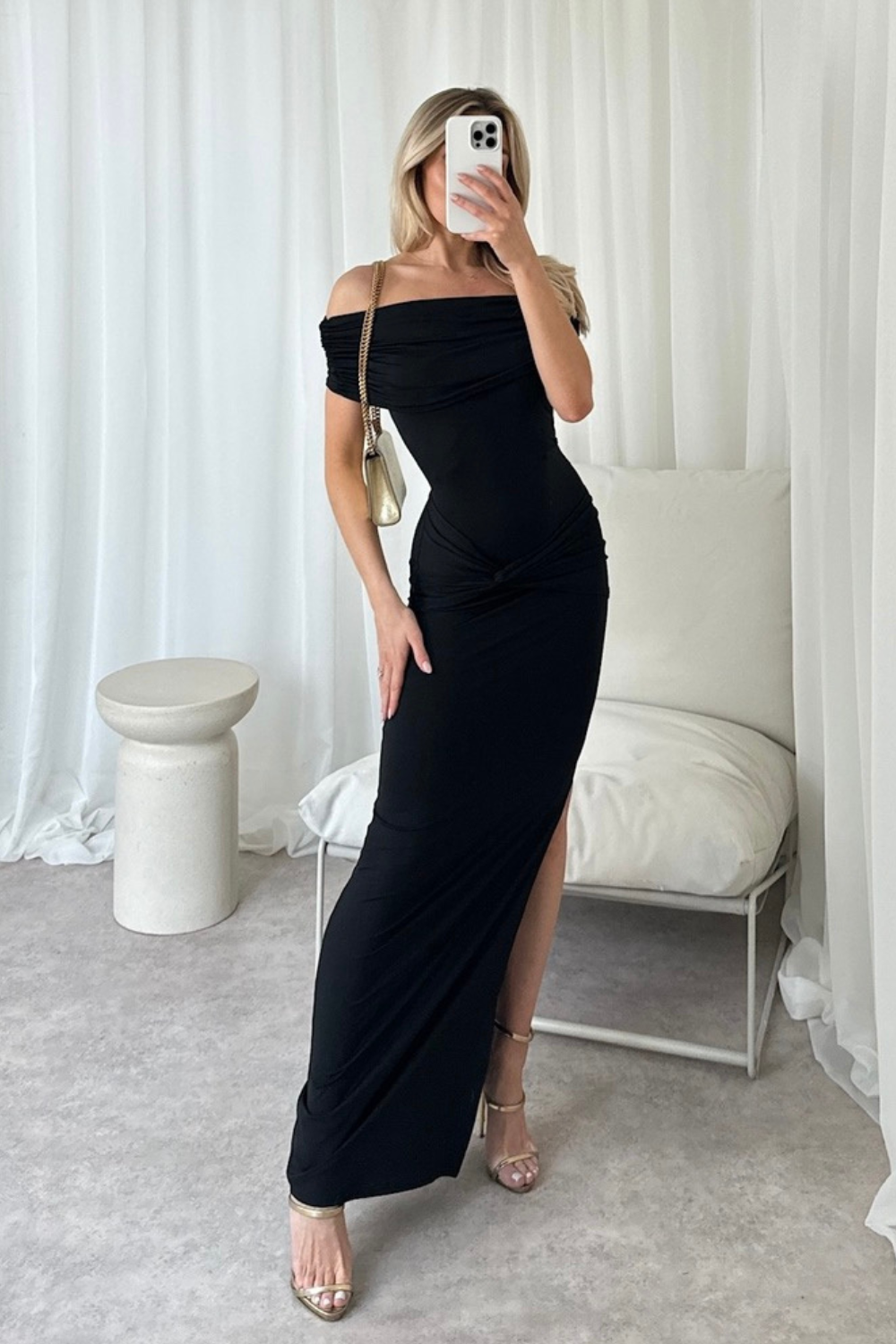 Transform your look with the Sasha off the shoulder maxi dress This versatile bardot style includes a twist knot detail and flattering stretch fabric, ensuring a perfect fit for any occasion. Embrace timeless elegance and comfort with this must-have maxi.