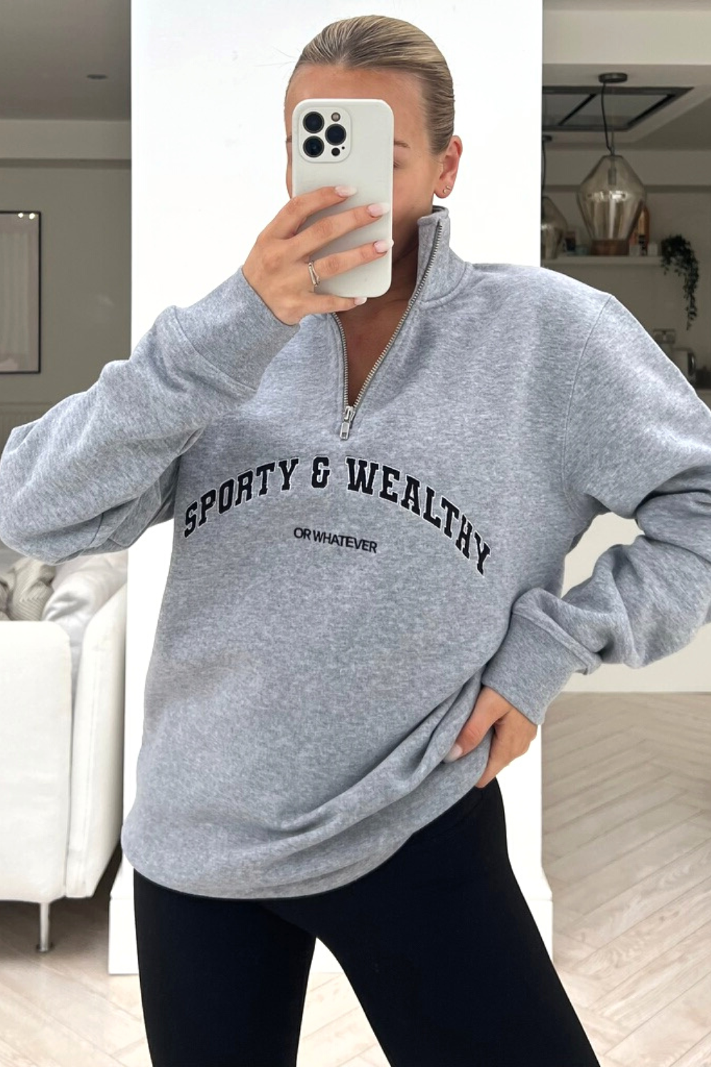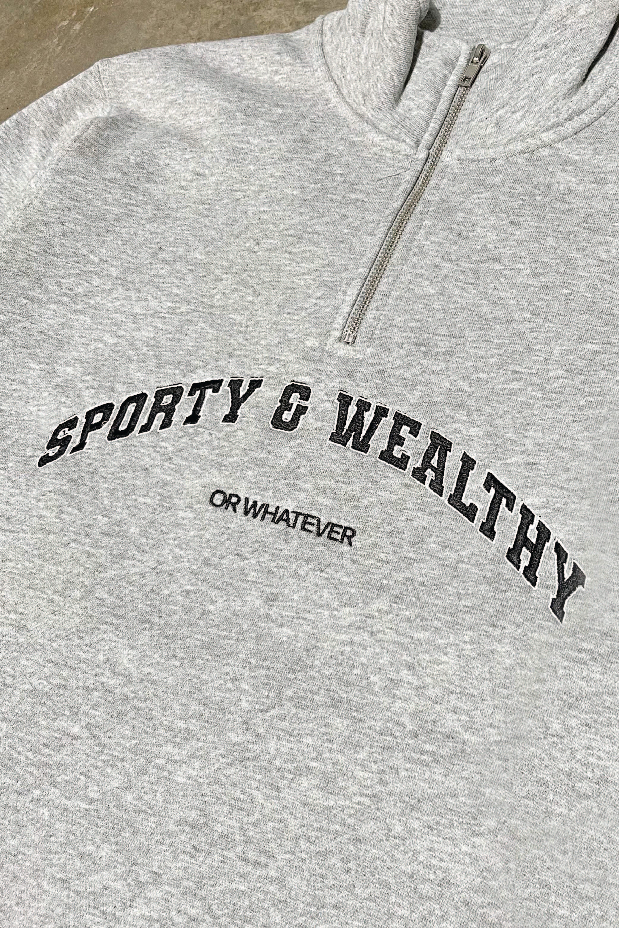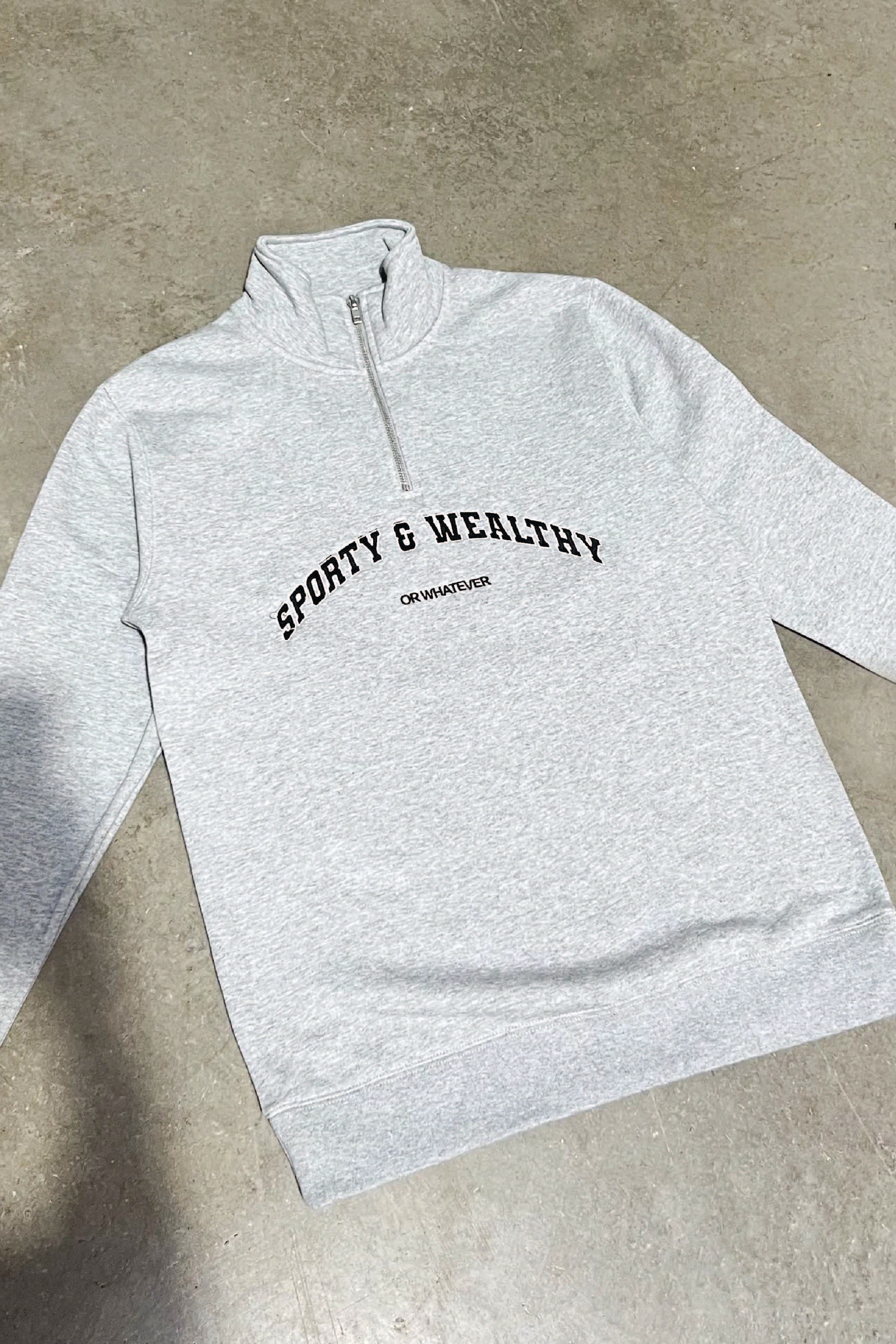 We all need a go to sweater and our newest arrival is exactly that !, our ' sporty & wealthy ' sweater is made from a soft fleece line grey material and has long sleeves and a 1/4 zip neck line . Style this with leggings or cycling shorts and fresh trainers for a complete look.