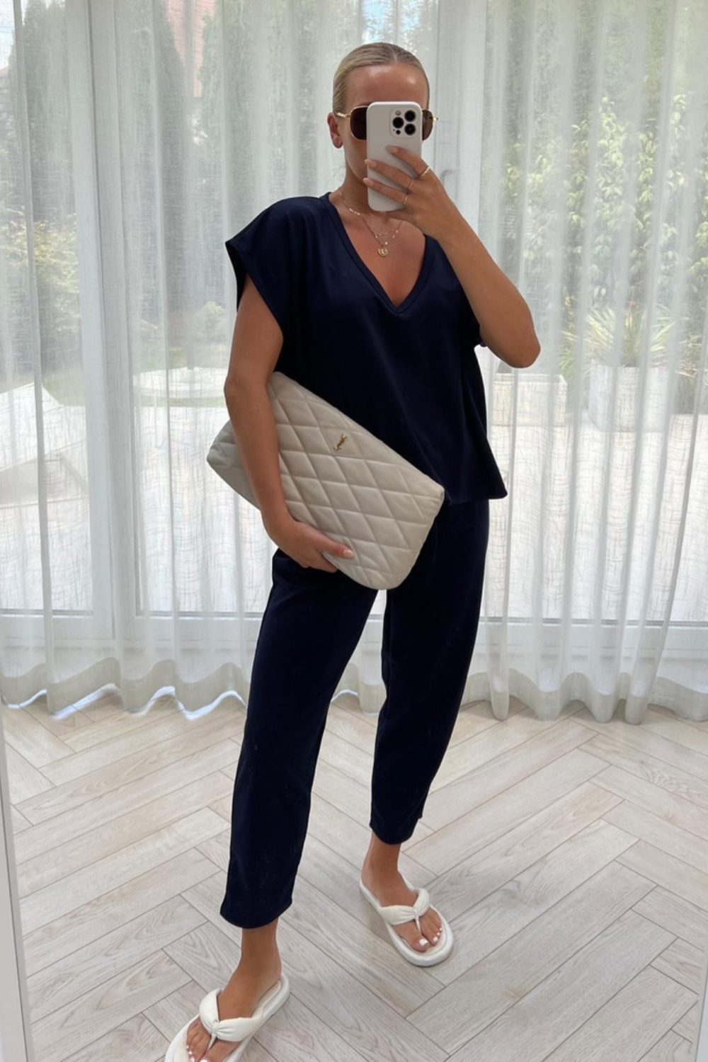 Your wardrobe is complete with this co-ord. Featuring s navy soft touch material, V neck design with short sleeve's and matching elasticated drawstring leggings with front pockets. Style this with crisp new trainers for that off-duty look
