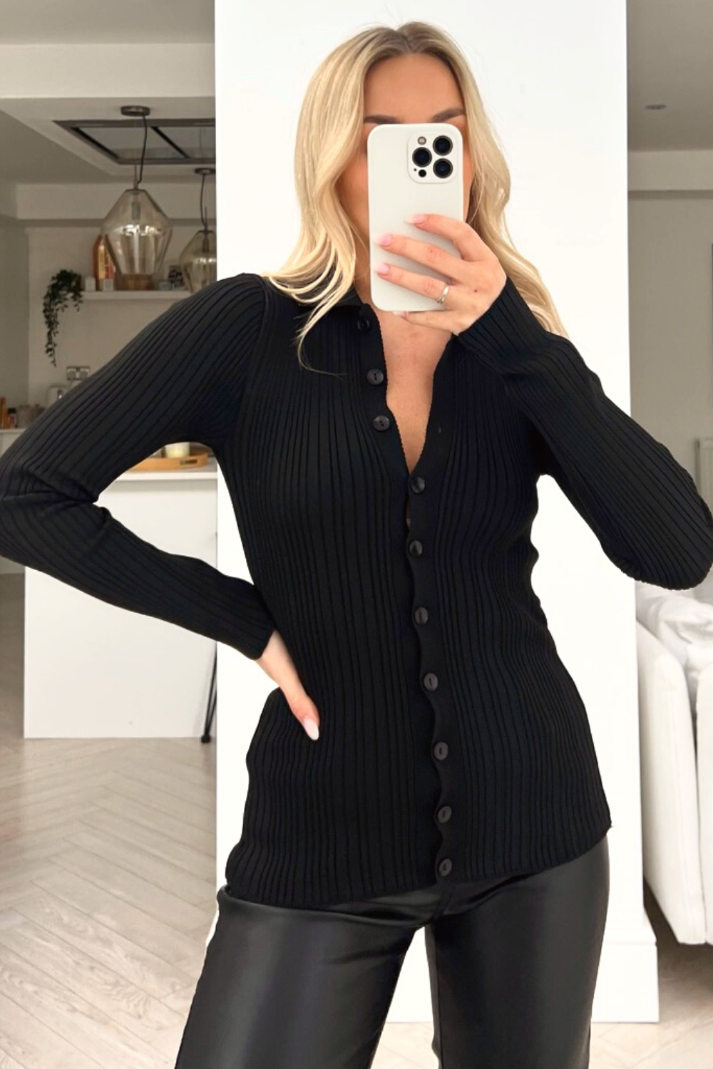 introducing our newest glamify arrival ' Sydney ', this is a stunning ribbed top made out of a sof black ribbed material, the top has a collared neck and a button up front finish. The top also has long sleeves and looks great paired with pu trousers or jeans