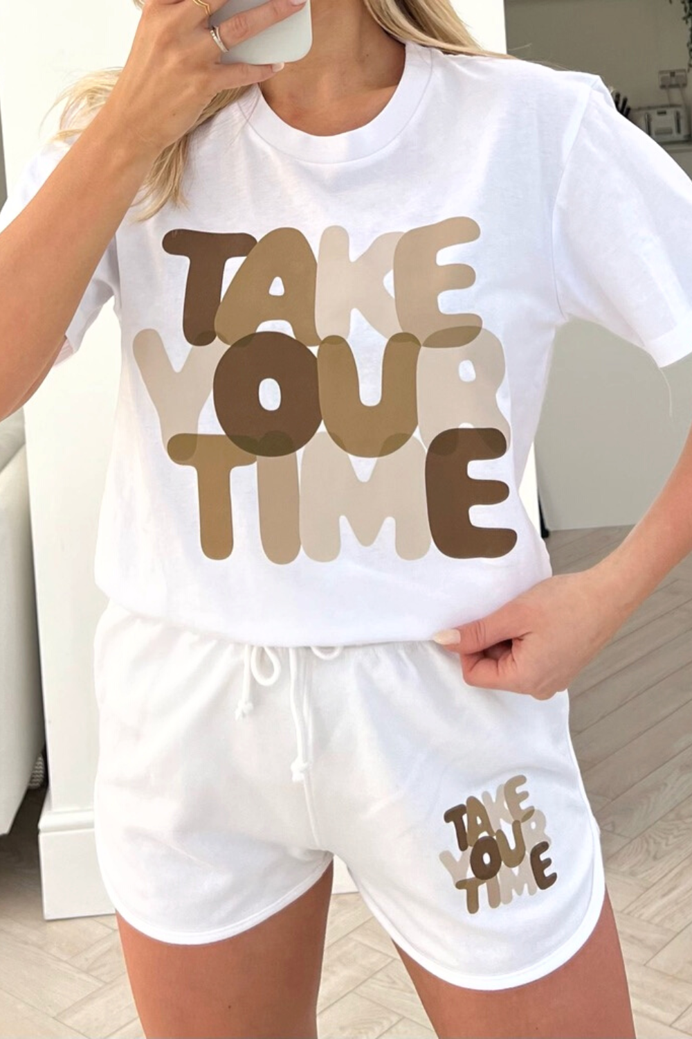 Introducing our newest short Co-Ord ' Take Your Time ', the set consists of a brilliant white t-shirt with our in house ' Take Your Time ' printed on the chest and a soft pair of matching white drawstring shorts, this is best styled with chunky trainers or sliders and it is perfect for summer and holiday wear