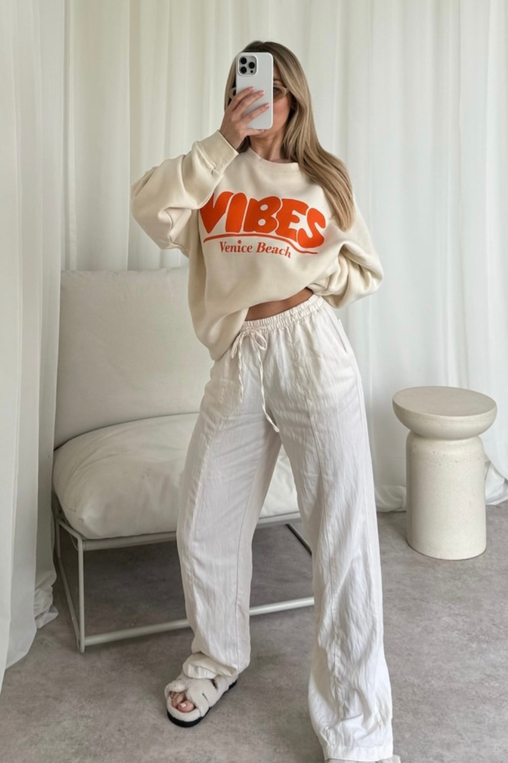 Featuring a soft-touch ecru material sweater with our the ' vibes venice beach ' printed design. This sweater is the perfect airport look just pair with some leggings or cycling shorts with sliders and your good to go.